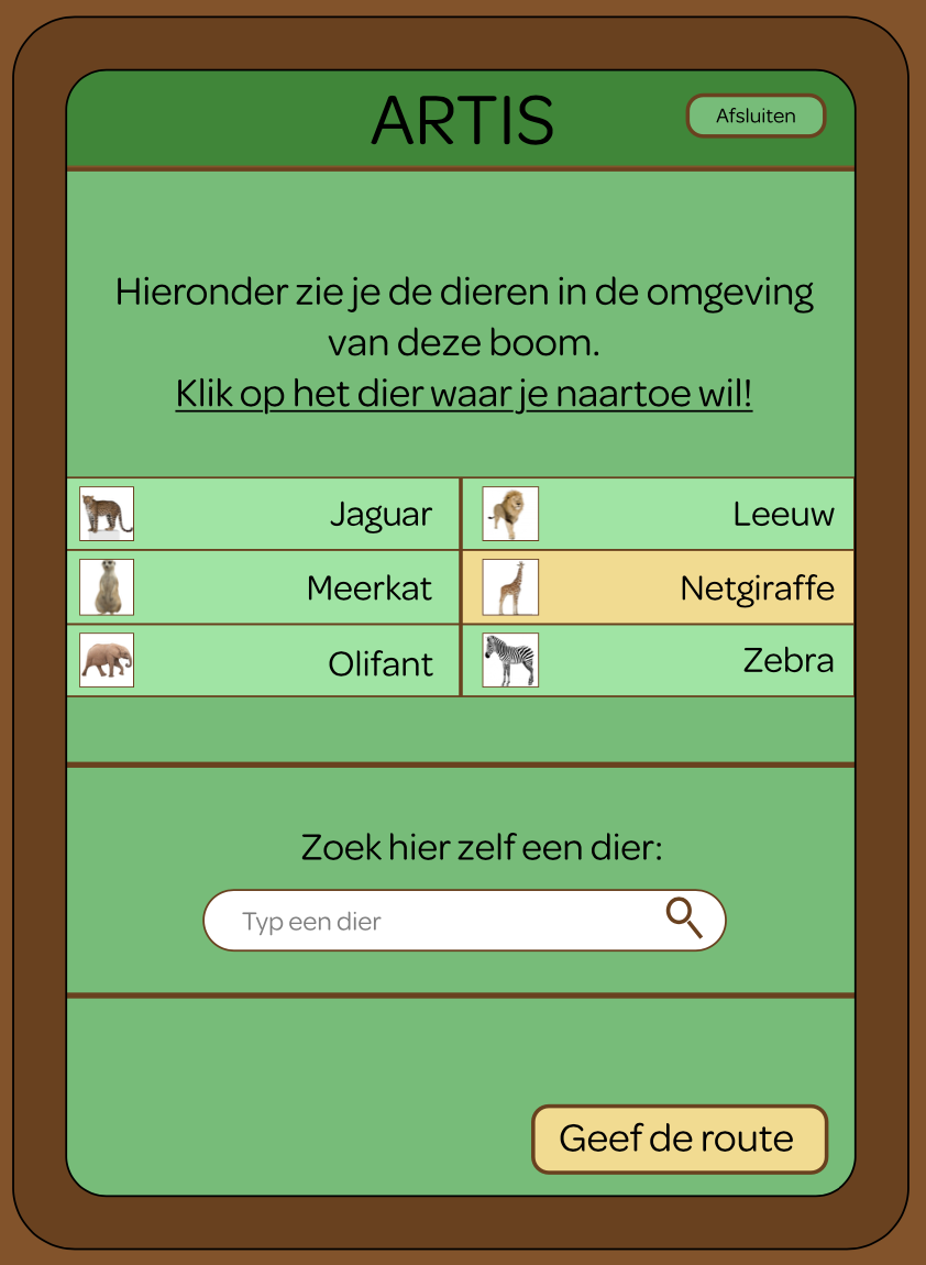 Ik heb een ontwerp gemaakt voor de nieuwe bewegwijzering voor Artis. Belangrijk hierbij is dat de bewegwijzering inspeelt op de kinderen, zij moeten de mogelijkheid hebben om de route te kunnen bepalen. Ik heb gekozen om de focus te leggen op UI/UX, mijn oplossingsrichting heeft een digitale interface.