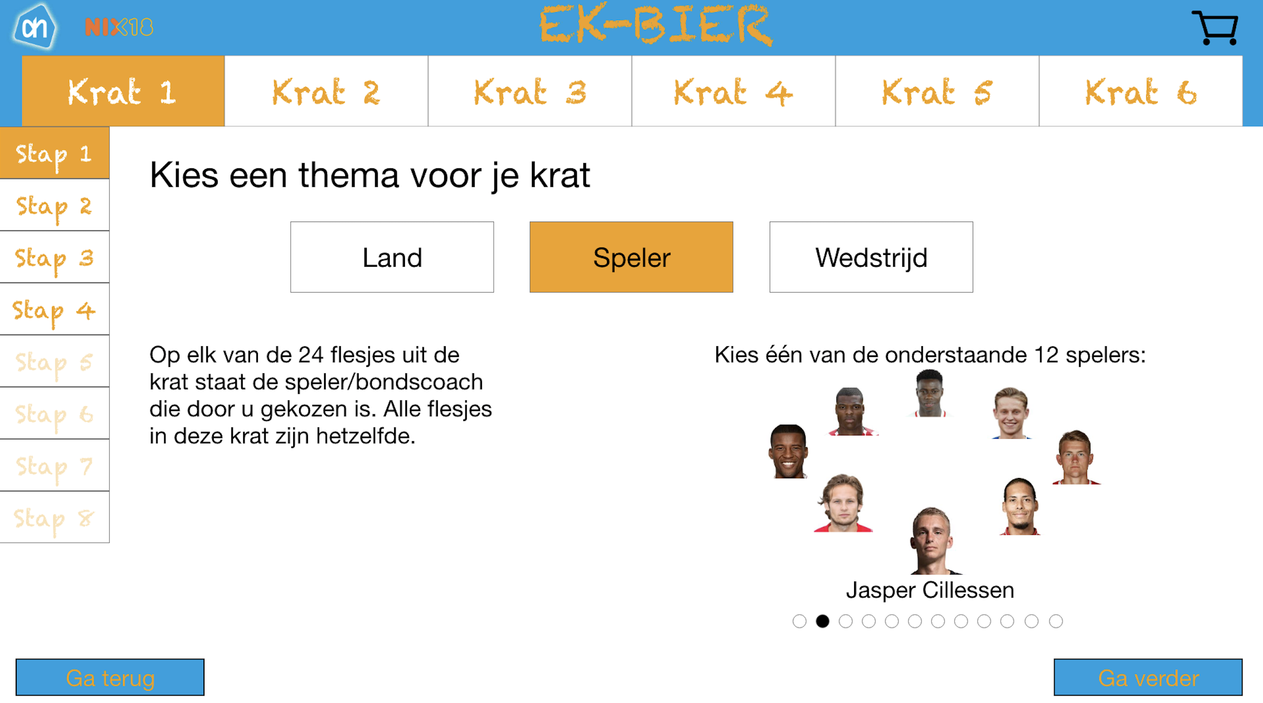 Tijdens het EK worden er veel artikelen aangeboden in het bijpassende thema. Albert Heijn wil bierkratten verkopen, die mensen zelf kunnen personaliseren. Maak een website waarop de gebruiker zelf kan kiezen hoe de krat eruit ziet, hoe de flesjes eruit zien, welk merk bier het is en waar nog extra artikelen bij besteld kunnen worden.
