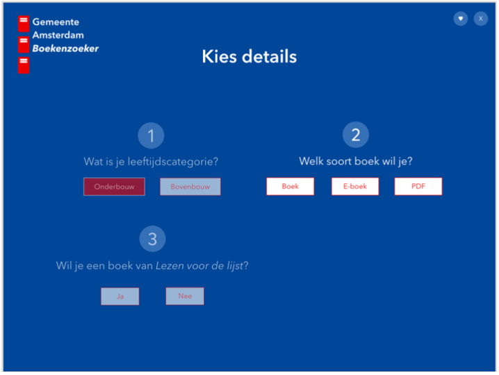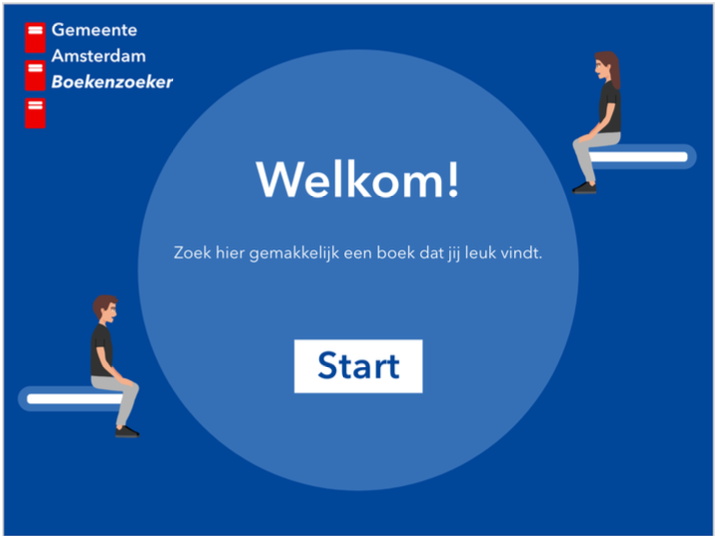 Met gebruik van de huisstijl van Gemeente Amsterdam, moest ik een applicatie maken voor een tablet die in de bibliotheek van een middelbare school staat. Deze tablet kunnen leerlingen gebruiken om een boek te zoeken dat in de bieb te vinden is. Door middel van de tablet kunnen ze makkelijk filteren op onder andere genre en niveau. Dit maakt het voor de leerlingen makkelijker en dus uitnodigender om een boek uit te zoeken.