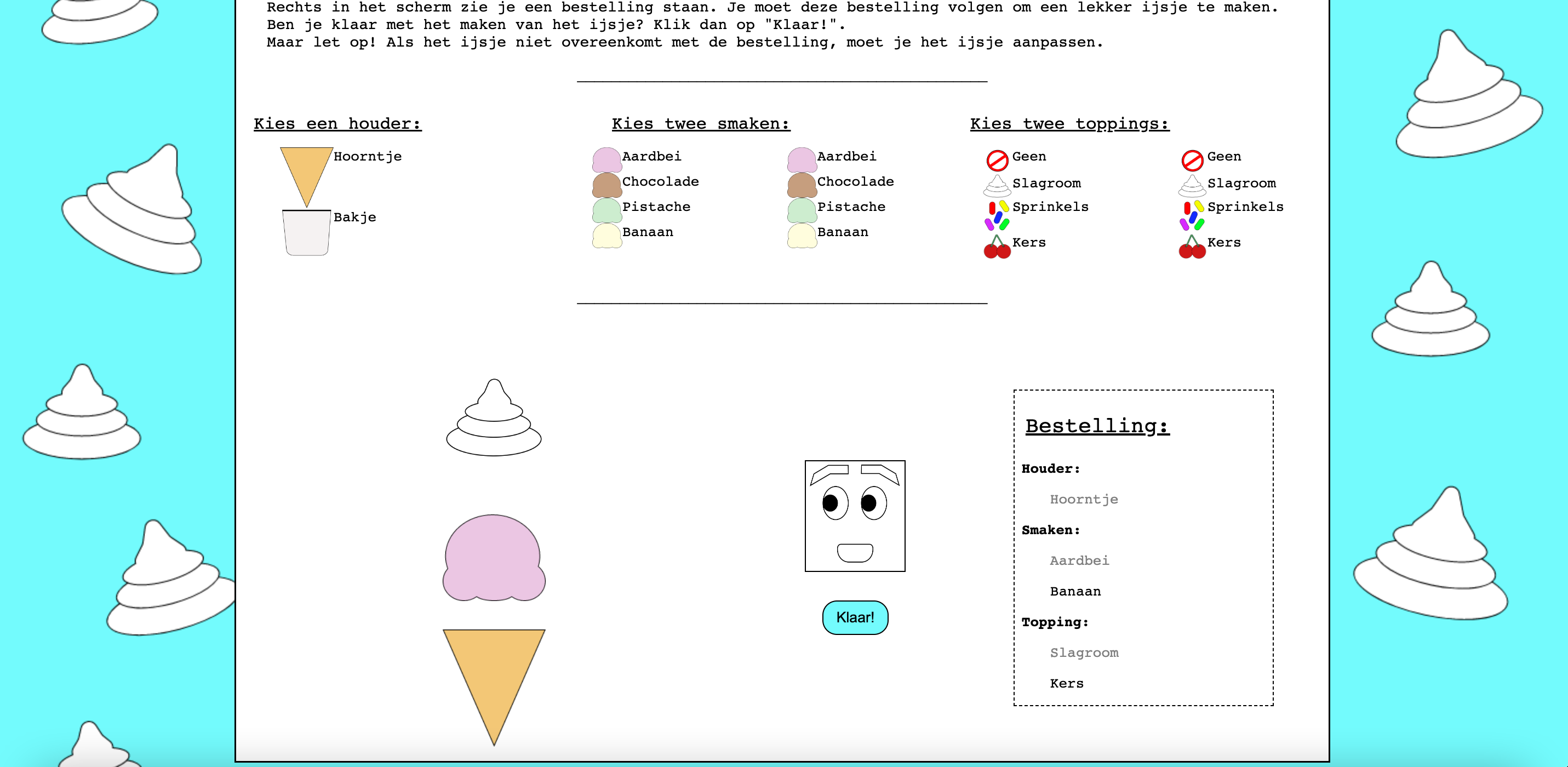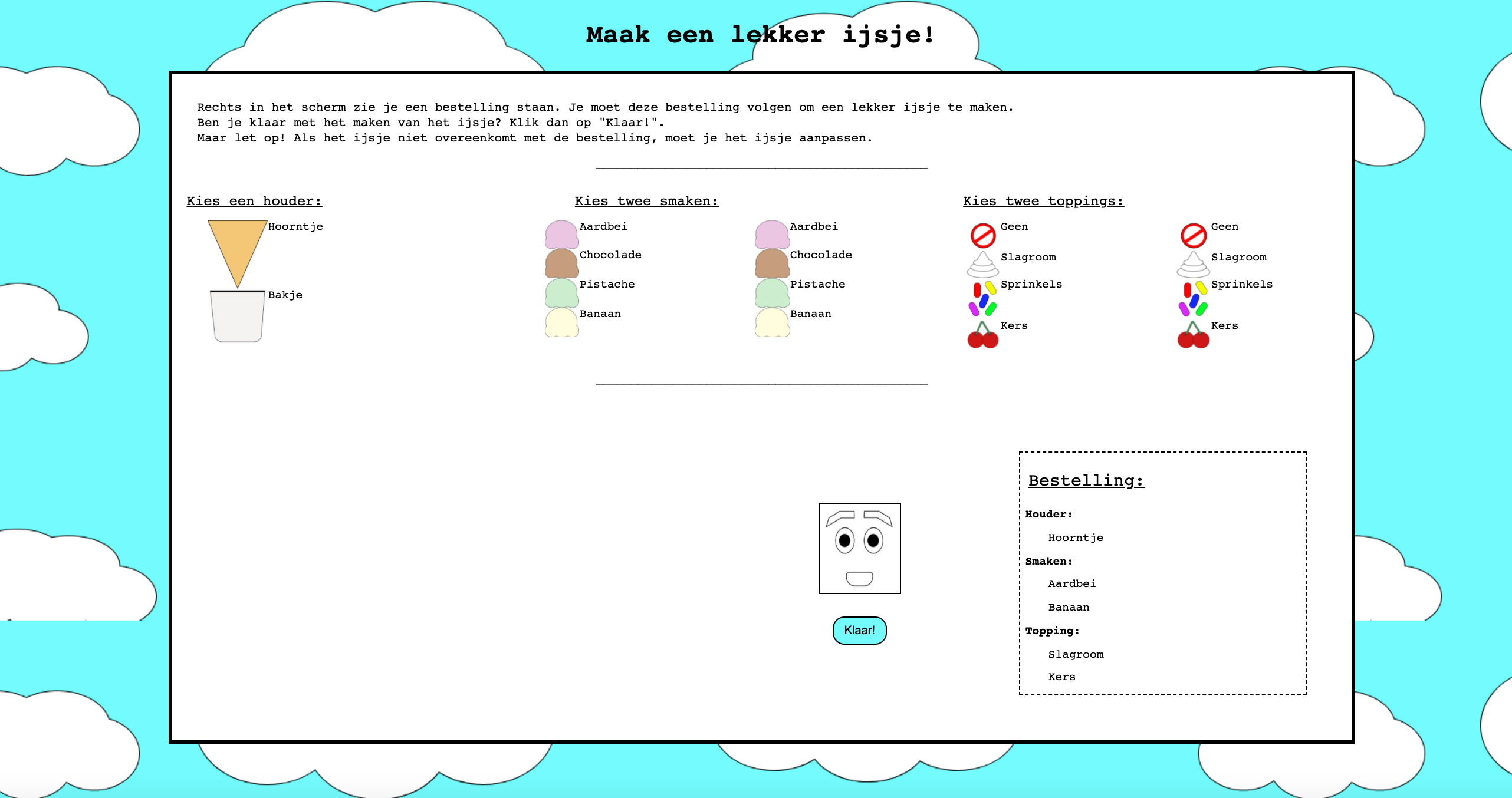 Voor dit vak moest ik een eigen tamagotchi maken. Ik heb hierbij gekozen om het iets uitgebreider te doen dan het standaard dier dat je eten en drinken geeft. Mijn "spel" draait erom dat je de gegeven bestelling volgt om een lekker ijsje te maken. Klopt de bestelling niet, dan laat het ijsje je dat weten door verdrietig te kijken. Klopt de bestelling wel, dan kun je door naar de volgende bestelling.