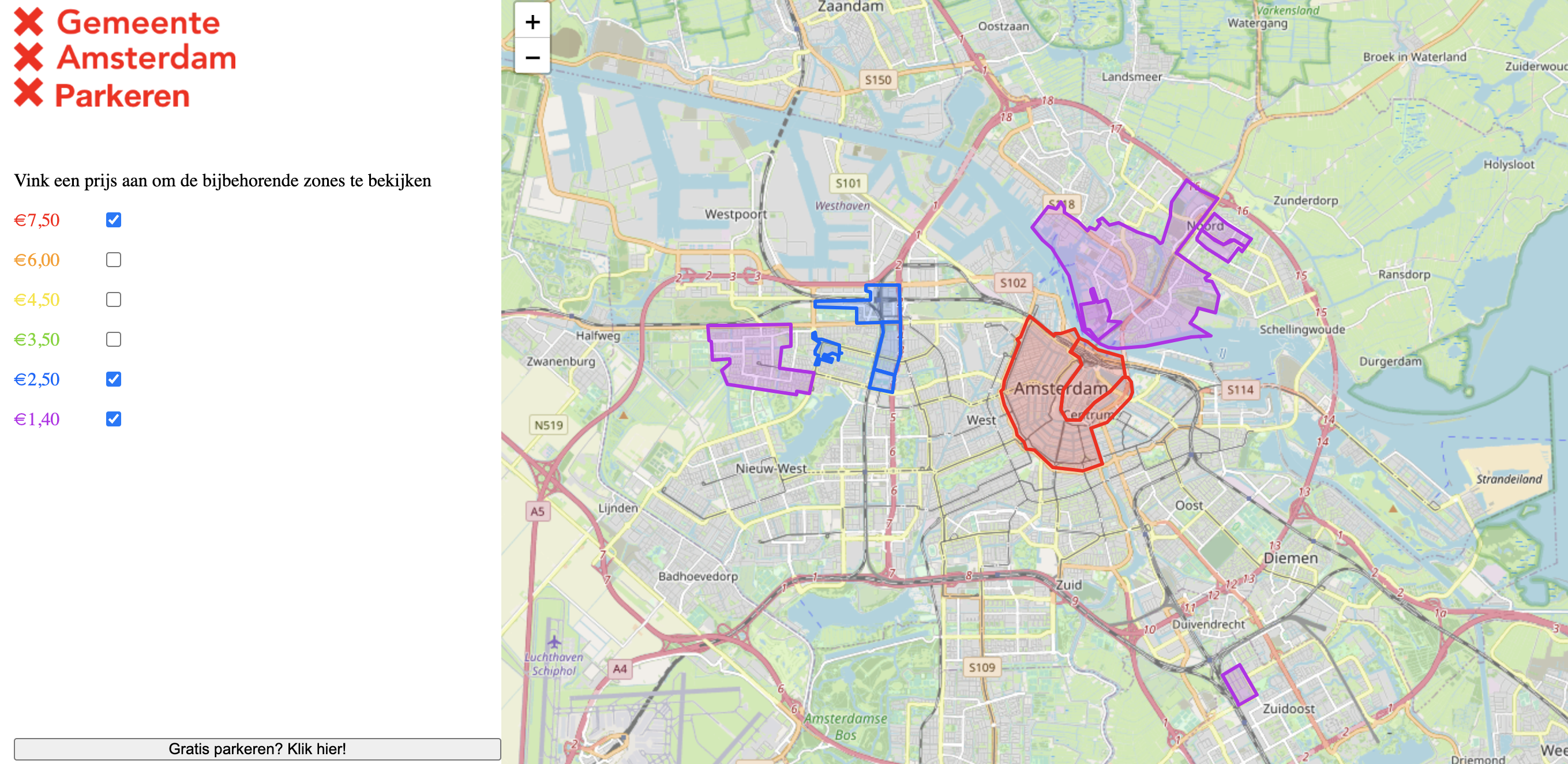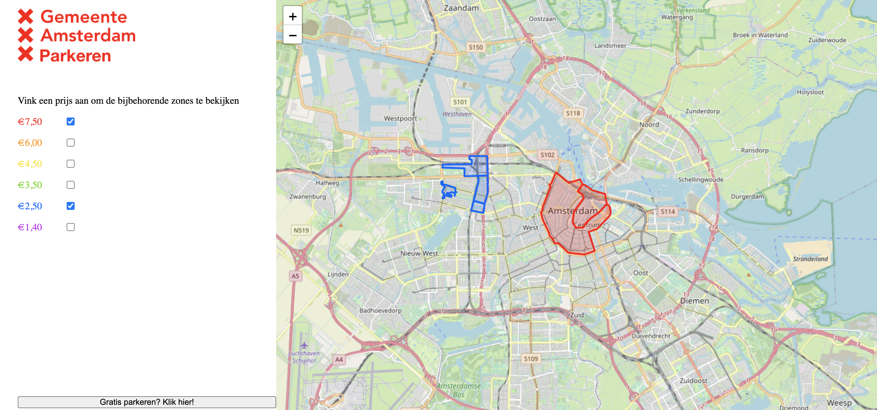 Ik heb ervoor gekozen om een applicatie te maken over parkeren in Amsterdam. De applicatie haalt de gegevens uit een API van Gemeente Amsterdam. Door middel van Leaflet wordt de kaart geladen en worden de gebieden op de kaart weergegeven.