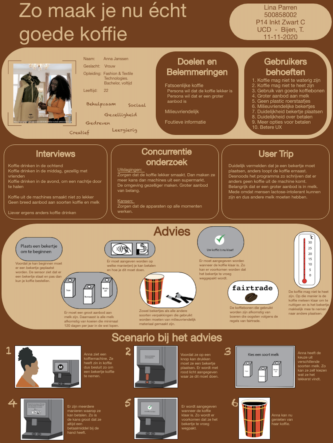 De opdracht bestaat uit verschillende onderdelen. De eerste stap is om onderzoek te doen naar de doelgroep. Begrijp waarom zij koffie drinken uit de machine en onderzoek hoe je dit proces makkelijker kan maken. De bevindingen worden duidelijk gemaakt naar het bedrijf door middel van een poster. Let daarbij op dat deze poster duidelijk is. Tekst, kleur en indeling spelen hierbij een rol.